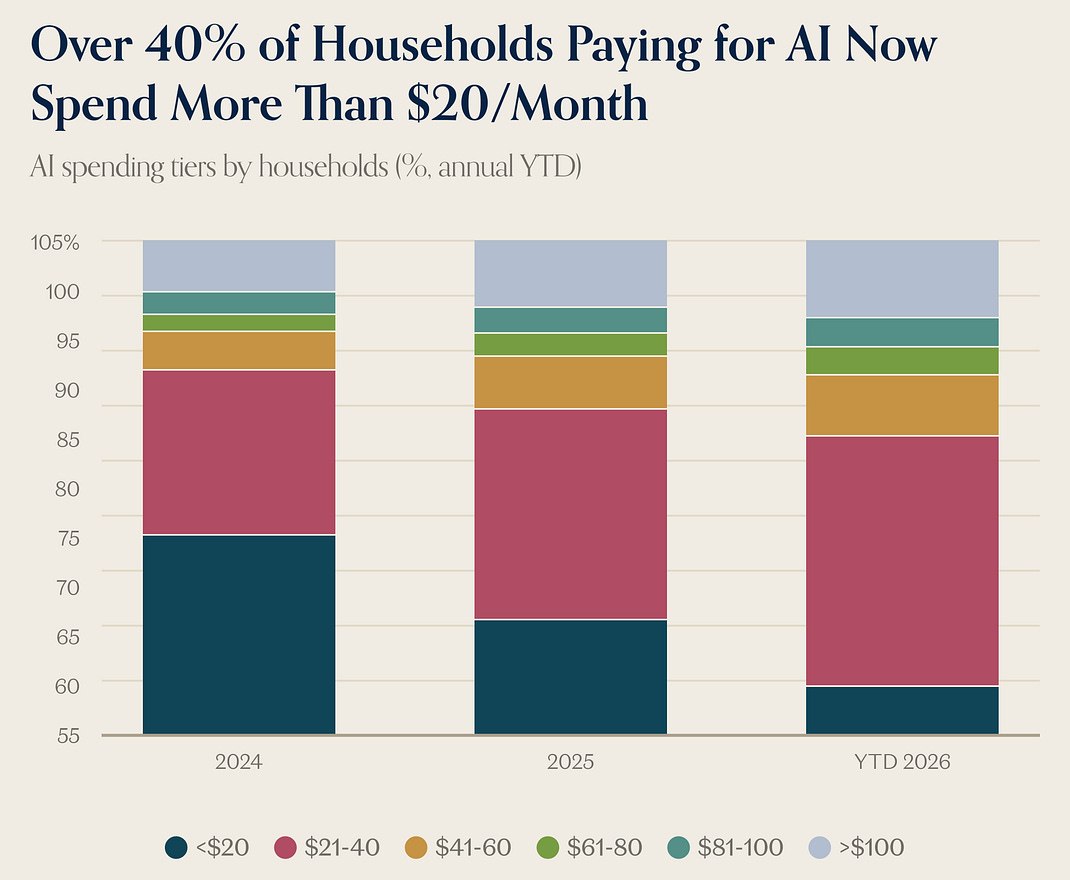 Consumer AI is still early, but spending is acceleratingConsumer AI adoption is high, but monetization is just starting. Only 3% of households pay for AI services, despite ~40% YoY growth in paying users since Feb 2024. Spending depth is improving: