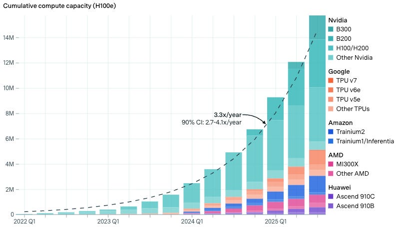 Global AI compute is explodingGlobal AI computing capacity has been growing ~3.3× per year since 2022, which means total available compute doubles roughly every 7 months (90% confidence range: 6–8 months). Key numbers