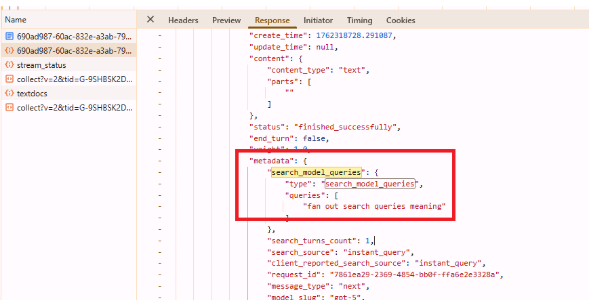 These variations show how GPT-5 interprets your intent and which keywords it thinks matter most. Why This Is Important1. SEO & Content Optimization 2. Prompt Engineering 3. Transparency & Research 4. Trend & Keyword Tracking How to Extract GPT-5’s Fan-Out QueriesYou don’t need any extensions or code — just Chrome’s built-in developer tools. Step 1: Ask a Web-Enabled Question Step 2: Copy the Conversation ID Copy the part after Step 3: Open Developer Tools