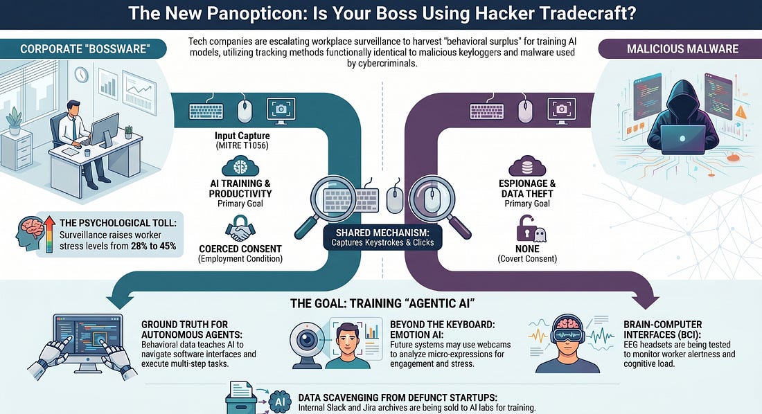 The New PanopticonCorporate Surveillance, Hacker Tradecraft, and the AI Data Gold RushThe recent revelation that Meta is deploying software to track the mouse movements, clicks, and keystrokes of its employees to train artificial intelligence models has sparked significant backlash and raised profound questions about workplace privacy. This initiative, dubbed the Model Capability Initiative (MCI), represents a significant escalation in corporate surveillance, blurring the lines between employer oversight, dystopian fiction, and malicious hacker tradecraft. The Orwellian ParallelSurveillance Capitalism in the WorkplaceThe comparison to George Orwell’s 1984 is not merely hyperbolic; it is structurally accurate. In Orwell’s dystopian society, the “telescreen” served as a two-way device that relentlessly broadcast propaganda while simultaneously monitoring individuals’ every move, ensuring total compliance and eliminating the possibility of dissent. Meta’s MCI functions as a modern, digital telescreen. By recording every keystroke, mouse movement, and taking periodic screenshots of employee workstations, the company achieves a level of granular surveillance that mirrors the totalizing oversight of the Party in 1984. The chilling effect is immediate: employees have expressed that the tracking makes them “super uncomfortable,” recognizing that such pervasive monitoring inherently stifles free expression and creates an environment of constant scrutiny. This phenomenon is a stark manifestation of what Harvard professor Shoshana Zuboff terms “surveillance capitalism.” Zuboff defines this as the unilateral claiming of private human experience as free raw material for translation into behavioral data. While initially applied to consumer data harvested by tech giants to create “prediction products” for targeted advertising, this logic has now turned inward. Employees’ digital labor and physical interactions with their machines are no longer just the means of production; they are the product itself, the “behavioral surplus” required to train the next generation of AI. The Hacker StrategyThe methods Meta is employing to gather this data are functionally identical to established hacker tradecraft. In the cybersecurity domain, the practice of recording keystrokes and mouse movements is known as Input Capture, specifically categorized under the MITRE ATT&CK framework as technique T1056. Keylogging (T1056.001)The most prevalent form of input capture is keylogging. A keylogger is a type of surveillance technology, often deployed as malware, used to monitor and record each keystroke on a specific device. Adversaries use keyloggers to intercept sensitive information, such as passwords, financial details, and confidential communications. Advanced Persistent Threats (APTs), sophisticated, well-resourced cyberattack groups often sponsored by nation-states, frequently utilize input capture to maintain long-term access and gather intelligence from compromised networks. The fact that a major technology corporation is deploying the same mechanism on its own workforce highlights a disturbing convergence between corporate management tools and malicious cyber espionage techniques. The Broader TrendMeta’s initiative is not an isolated incident but part of a broader, aggressive trend in corporate data collection driven by the insatiable data requirements of AI models. As large language models (LLMs) exhaust publicly available internet data, AI companies are desperately seeking new sources of high-quality, human-generated content. Liquidating Defunct Startups for DataOne of the most striking examples of this trend is the emerging market for the digital remains of failed companies. Defunct startups are increasingly selling their internal communications, including Slack archives, Jira tickets, and email threads, to AI labs as training data. Companies like SimpleClosure, which assist in shutting down startups, report processing numerous deals where internal workplace data is sold for hundreds of thousands of dollars. This practice raises severe privacy concerns. Even if attempts are made to anonymize the data, internal communications are inherently rich in personally identifiable information, candid discussions, and proprietary business logic. The transformation of private employee interactions into commodified training data without explicit, informed consent represents a massive breach of trust and a redefinition of workplace privacy. The Rise of “Bossware” and AI MonitoringThe use of employee monitoring software, often termed “bossware,” has skyrocketed, particularly following the shift to remote work. Recent statistics indicate that 74% of US employers now use online tracking tools, and 61% utilize AI-powered analytics to measure employee productivity or behavior. This surveillance takes a significant toll on workers. Employees in high-surveillance environments report stress levels of 45%, compared to 28% in low-surveillance settings, with 59% reporting stress or anxiety directly caused by workplace monitoring. The Value of Behavioral Data for AICurrent AI models are highly capable of generating text and answering questions, but they struggle with executing complex, multi-step tasks within software environments. They lack the contextual understanding of how humans actually navigate interfaces, use keyboard shortcuts, switch between applications, and correct errors in real-time. Behavioral data, the exact sequence of keystrokes, mouse movements, and clicks, provides the “ground truth” necessary to train AI agents to perform these actions autonomously. As Meta CTO Andrew Bosworth noted, the goal is to build agents that “primarily do the work,” requiring models to learn from “real examples of how people actually use [computers]”. "We are training our replacements, with or without our consent." In the contact center industry, for example, while AI can transcribe calls and s
