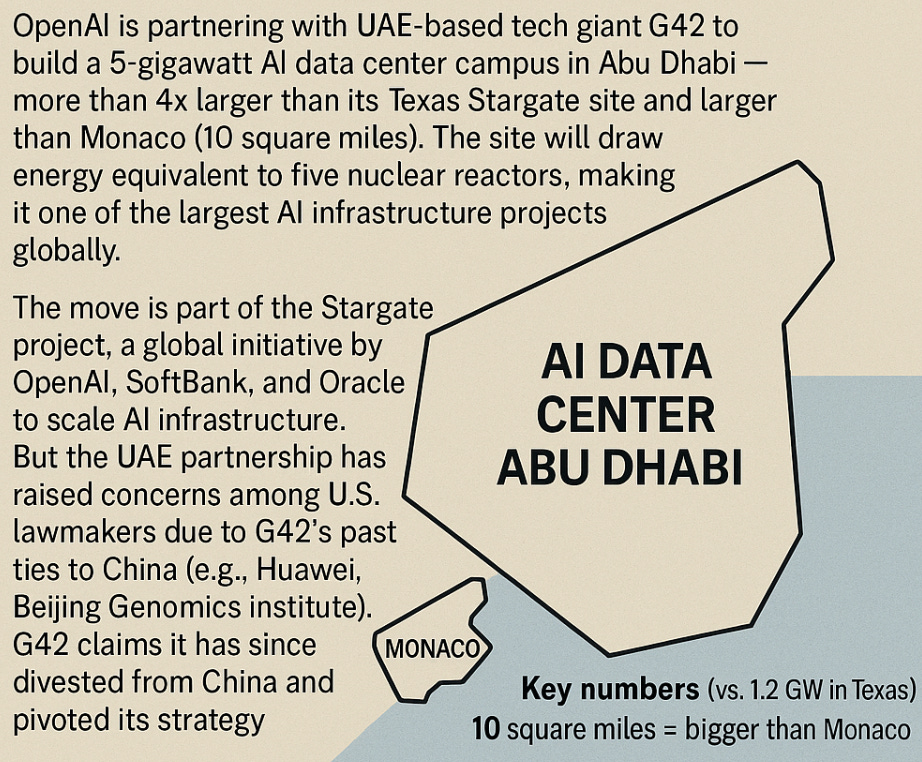 OpenAI’s Next AI Superhub in Abu Dhabi Will Be Bigger Than MonacoOpenAI is partnering with UAE-based tech giant G42 to build a 5-gigawatt AI data center campus in Abu Dhabi — more than 4x larger than its Texas Stargate site and larger than Monaco (10 square miles). The site will draw energy equivalent to five nuclear reactors, making it one of the largest AI infrastructure projects globally. The move is part of the Stargate project, a global initiative by OpenAI, SoftBank, and Oracle to scale AI infrastructure. However, the UAE partnership has raised concerns among U.S. lawmakers due to G42’s past ties to China, such as its association with Huawei and the Beijing Genomics Institute. G42 claims it has since divested from China and pivoted its strategy. Key numbers: