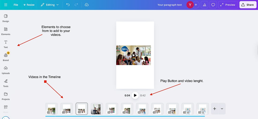 Text: Add titles, captions, or lower-thirds (Canva has pre-styled text animations). Elements: Insert shapes, icons, stickers, or animations. Brand Kit: If you have Canva Pro, you can apply your brand’s fonts, colors, and logos.