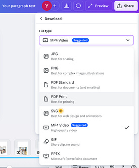 Click Share → Download. Choose format: Adjust resolution: 1080p (default) for general use. 4K (Pro users) for high-end content. You can share your video on social media straight from Canva