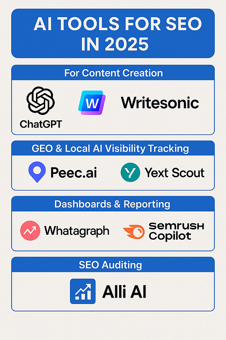 Hey Team, this great Guide was created by the SEO / GEO expert Mr. Wallace Chu, who has been helping us with our optimization efforts and is now sharing some tools for us to use. Enjoy. AI tools for SEO are transforming the way businesses approach search optimization by making it faster, smarter, and more scalable. From content creation to visibility tracking, reporting, and technical site improvements, these platforms are helping marketers cut down on repetitive tasks while uncovering new growth opportunities. Below, we highlight some of the most impactful tools to consider in 2025, organized by their role in the SEO workflow. For Content Creation