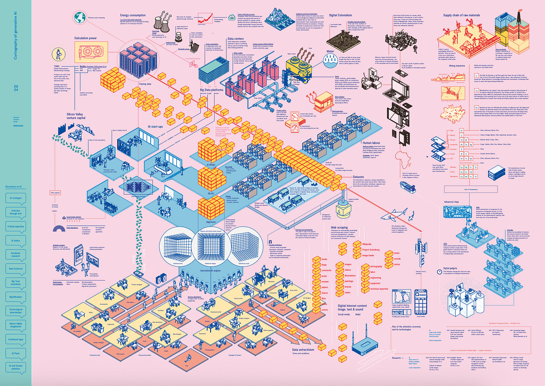 The Cartography of Generative AI 2025AI does not run on code alone; it learns from examples. Generative AI models are processing billions (if not trillions) of words, images, and sounds to find patterns and reassemble them into new text, visuals, and music for output purposes. This isn’t intelligence, but rather statistical mimicry powered by vast datasets, expensive chips (mostly from Nvidia/TSMC), and global labor networks. Behind every chatbot or image generator lies a chain of extraction: internet data scraped without consent, underpaid human labelers in the Global South, and energy-hungry data centers that consume water and power equal to tens of thousands of homes. Each model update generates more servers, increased energy use, and additional waste, making AI’s footprint larger than that of aviation. Culturally, AI shifts from prediction to creation, automating aesthetics, storytelling, and human expression. Economically, it’s dominated by a few U.S. firms and venture-backed startups driving both hype and infrastructure growth. Politically, it shapes discourse, regulation, and misinformation. 🧰 AI Guides