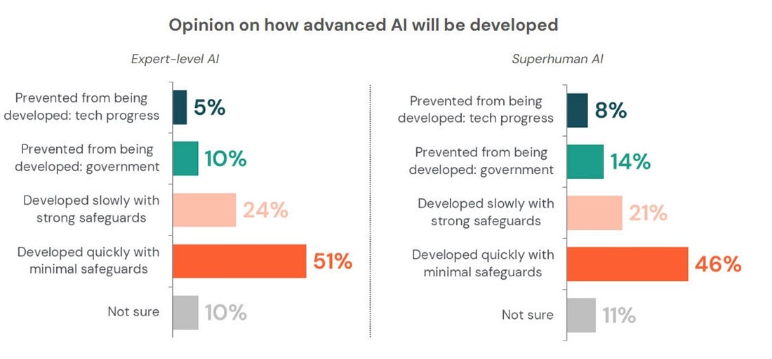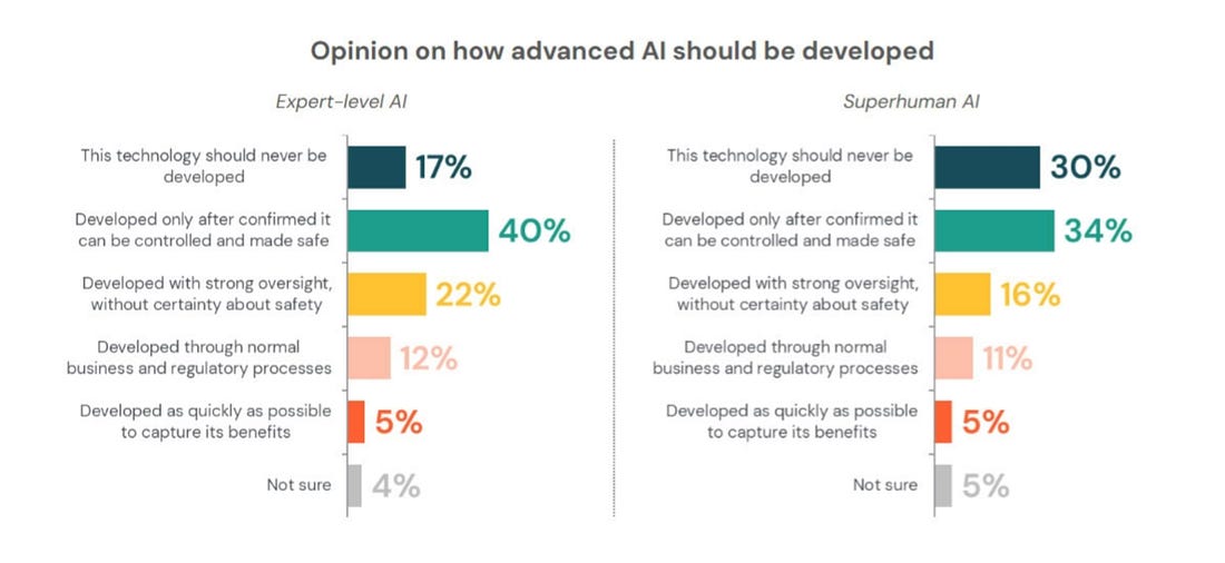The public opinion is that Advanced AI should be developed only after confirming that it can be controlled and traded safely. In reality, technologies have never been fully controlled and safe. From the invention of the wheel, which facilitated moving heavy loads but initially created accidents that were not seen before at the time, to the widespread use of the internet and social media, and the repercussions that these developments brought about, some of which we are barely discovering after years of use. From social anxiety, political influence, deepfakes, and hacks, to what we are barely experiencing now with the advent of AI. On the other hand, most believe that it will continue to be developed quickly with minimal safeguards. There is too much at stake now, and governments are in an AI supremacy battle that they do not what to lose. What we are reading:
